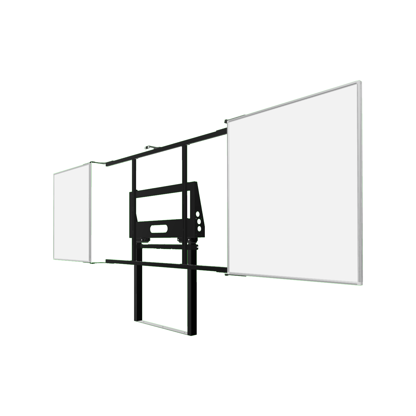 Die Pylonen lassen sich manuell in der Höhe verstellen, ohne zusätzlichen Mechanismus. Je nach Modell, können optional seitliche Tafeln ergänzt werden, z. B. klassische grüne Stahlemalie-Tafeln oder Whiteboards. So entsteht eine funktionale Einheit, die sowohl digitales als auch analoges Arbeiten unterstützt.