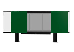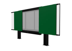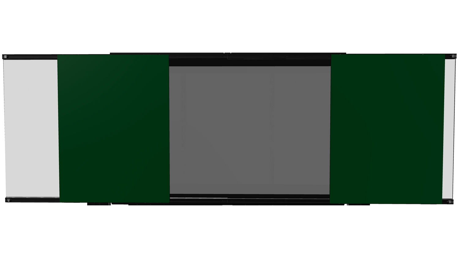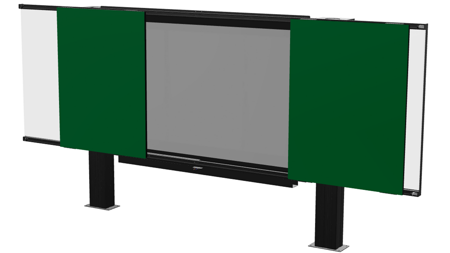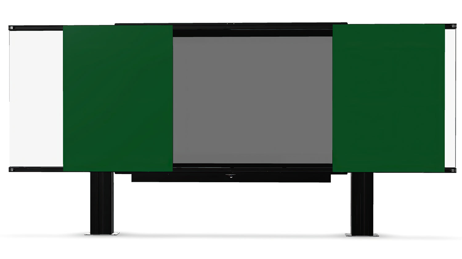 - Zwei fest installierte Tafelflächen in klassischem Grün oder neutralem Weiß, links und rechts des Displays.