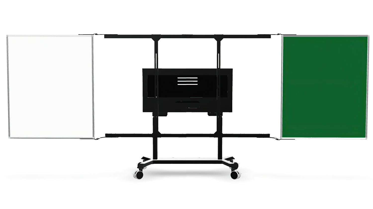 Für den Einsatz in Schulen, Konferenzräumen und Präsentationsumgebungen lässt sich der ANDY ECO optional mit seitlich klappbaren Tafelflügeln ausstatten. Diese bestehen aus langlebiger, magnethaftender Stahlemaille und sind wahlweise als Whiteboard- oder Kreidevariante erhältlich. Über einen stabilen Trägerrahmen lassen sich die Flügel einfach und passgenau montieren. Im geschlossenen Zustand verdecken sie das Display vollständig und ermöglichen so die klassische Tafelnutzung mit digitalem Mehrwert – perfekt für hybride Unterrichts- und Präsentationsformen. Schraubenlose Sicherheitsecken und eine 25-jährige Garantie auf die Schreibflächen unterstreichen die Langlebigkeit und Qualität des Systems.