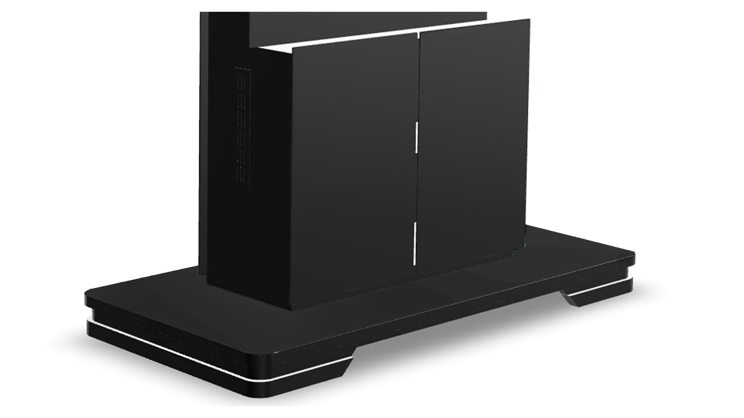 Ein besonderes Highlight der Medienstele ist die werkzeuglos abnehmbare Frontabdeckung mit Klicksystem. Sie ermöglicht schnellen Zugriff auf die verbaute Technik, während Kabel und Anschlüsse dezent verborgen bleiben. So überzeugt die Stele nicht nur durch ihre Funktionalität, sondern auch durch eine aufgeräumte, moderne Optik – ideal für Konferenzräume, Klassenräume oder Empfangsbereiche. Ergänzend bietet die integrierte Schranklösung im vorderen Bereich praktischen Stauraum: Mediengeräte, Fernbedienungen, Kabel oder Dokumente können sicher und ordentlich verstaut werden. Dank der Push-to-open-Türen bleibt die Front frei von Griffen und wirkt besonders elegant. In Kombination mit der massiven Bauweise und den flexiblen Ausstattungsmöglichkeiten präsentiert sich die Medienstele als stilvolle All-in-One-Lösung, die Technik und Ordnung perfekt miteinander verbindet.