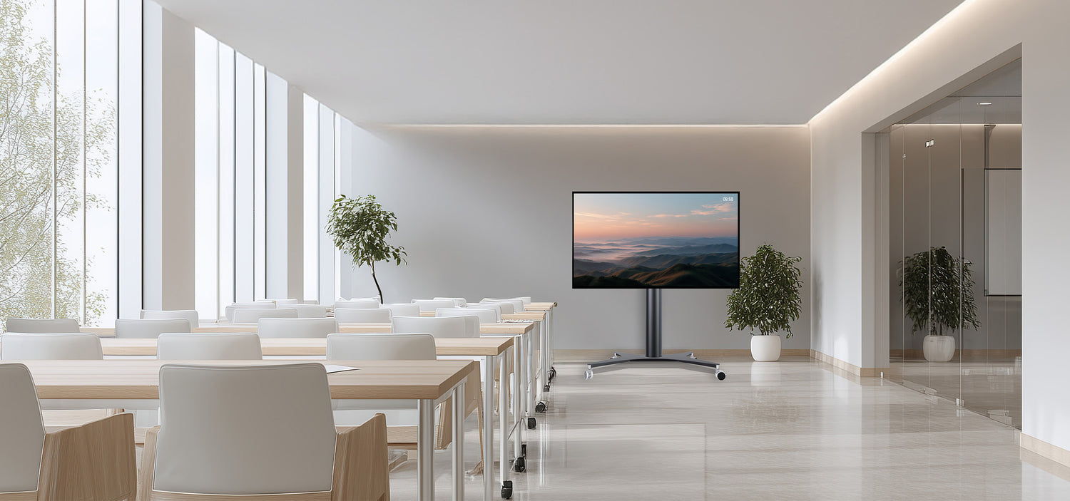 Der Displayständer ist mit allen gängigen Standard-VESA-Halterungen von 400 × 600 bis 800 × 600 kompatibel und damit universell für eine Vielzahl an Displays einsetzbar. Eine praktische Rückwandabdeckung mit integriertem Stauraum bietet Platz für Zubehör wie Mini-PCs oder Medientechnik und sorgt gleichzeitig für eine saubere Integration. Ergänzend führt das verdeckte Kabelmanagement alle Leitungen unsichtbar entlang der Konstruktion und lässt störende Kabel elegant verschwinden. Auf diese Weise verbindet das System maximale Funktionalität mit einer aufgeräumten, modernen Optik, die in jedem Klassenzimmer, Konferenzraum oder Präsentationsumfeld einen professionellen Eindruck hinterlässt.